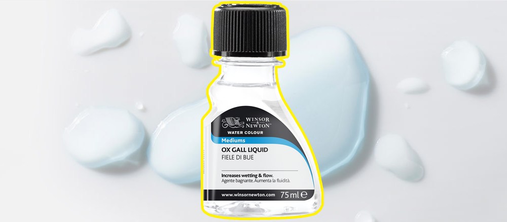 Ox Gall Liquid er en "wetting agent" som brukes til å forbedre flyten når den blandes direkte med akvarellmaling, den øker malingens flytende karakter. Ox Gall Liquid kan også brukes på veldig hardt papir for å redusere overflatespenningen. ![]()