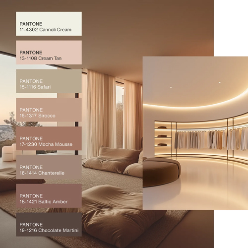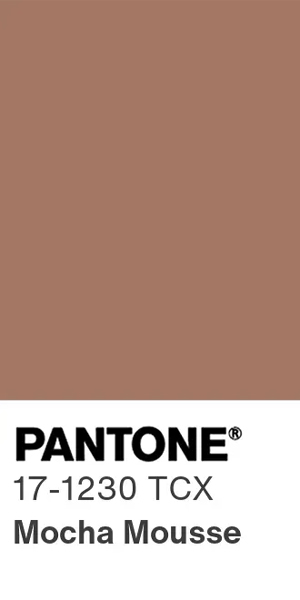 Årets farge, PANTONE 17-1230 Mocha Mousse er en allsidig nyanse fylt med iboende raffinement og jordnær raffinement, og skaper et sterkt kromatisk fundament, som komplementerer ulike bruksområder, både minimalistisk og rikt dekorert, på tvers av design og alle fargebevisste bransjer. Pantone har laget fem unike fargepaletter med PANTONE 17-1320 Mocha Mousse, som hver formidler sin egen særegne følelse og stemning.