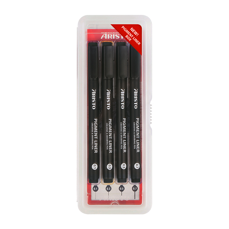 Sett med 4 penner. Sort, pigmentert fine liner tusj med fiberspiss som holder godt på strekbredden fra Aristo.
