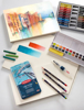 Settet er spesielt ideelt på reise og inneholder 12 halfpans, en mini waterbrush, en svamp og fem minipaletter i lokket.