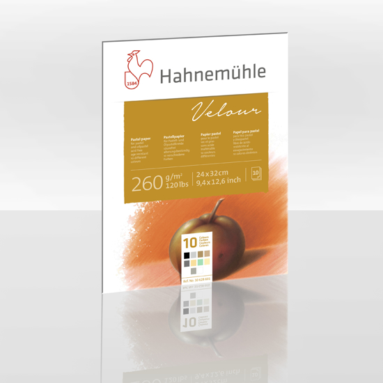 Pastell Velour er 260 gram papir med en unik fløyelsstrukturert overflate som er ideell for pasteller, kritt og kull. Overflaten holder på farger og merker, noe som gjør den utmerket for detaljerte arbeider og ekstra tekstur. Ark i 10 forskjellige farger: hvit, mellomgrå, gul, grønn, oransje, mørk grå, sand, oker, lys grå, svart