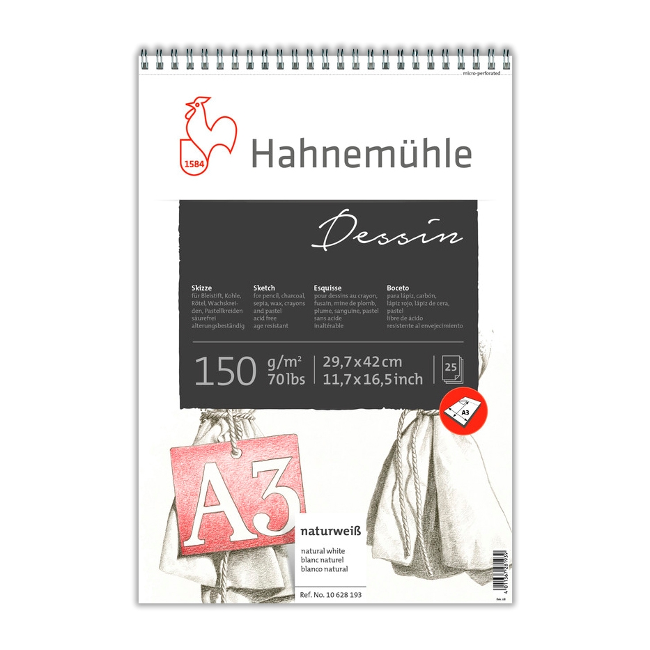 Dessin er et syrefritt skissepapir på 150 gram fra Hahnemühle med spiral. Blokken inneholder 25 ark.