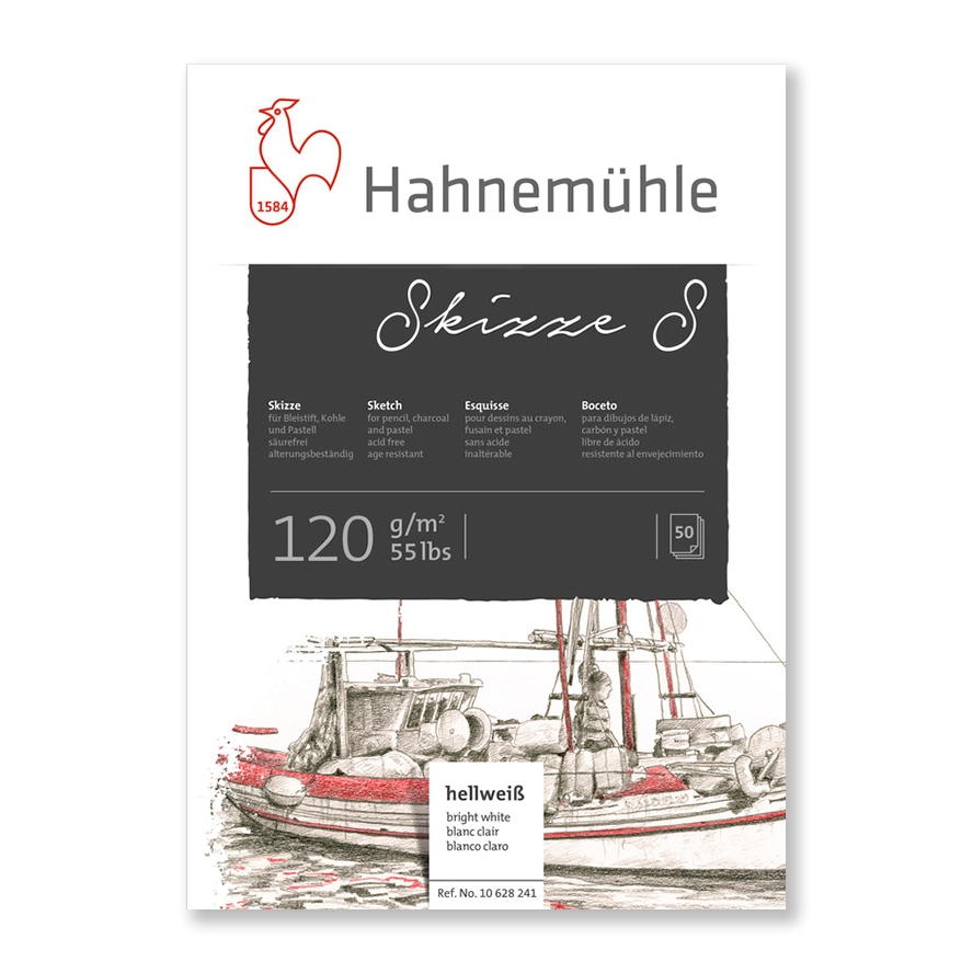 Skizze S er en skisseblokk med syrefritt skissepapir fra Hahnemühle. Papiret har en fin, glatt struktur og egner seg godt for både blyant, kull, kritt og pastell. Skisseblokken inneholder 50 ark i 120 gram, som har en off white tone.