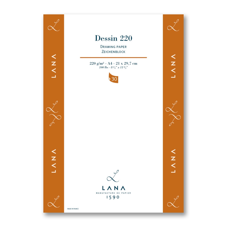 Tegneblokk "Dessin 220" fra Lana. Dessin er et 220 grams syrefritt papir med medium struktur og grovere overflate enn våre andre tegnepapir. Dessin har en naturlig hvit farge. Dessin egner seg for alle type teknikker av tegning med tørre medier, samt lette strøk med maling. Blokken inneholder 30 ark.