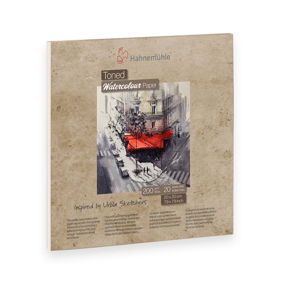 Hahnemühle Toned Watercolour Pads er akvarellblokker med tonet papir i beige og grå. Papiret har en jevn, finkornet akvarellstruktur og er på 200 gram. Akvarellblokkene inneholder 20 ark, og kommer i A5, A4 og 20x20 cm.