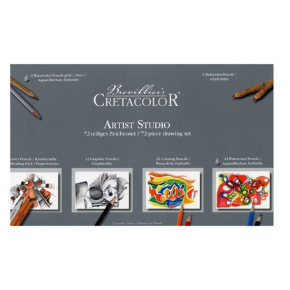 Et komplett tegnesett som inneholder: 12 grafittblyanter, 7 skisseblyanter, 1 tegnestubb, 24 akvarell fargeblyanter, 24 permanente fargeblyanter, 2 gull/sølv blyant, 2 blyanter med 4-farget mine.
