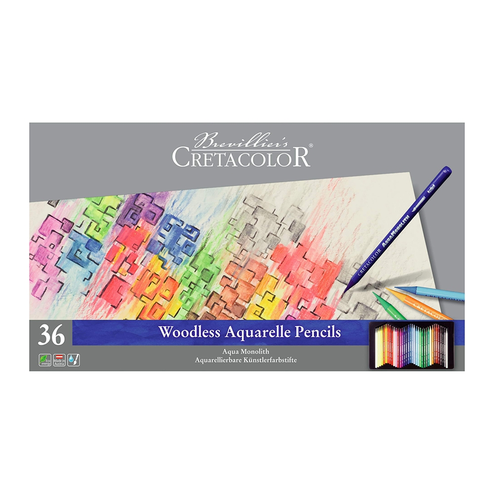 Sett á 72 farger. Aqua Monolith fra Cretacolor er et 100% fargeprodukt. Fargeblyanten er trukket med fargeløs film så farge ikke smitter av på hendene. Aqua Monolith gir skarpe fine kanter når du tegner, og hele blyanten brukes, og fargepigmentene er de samme som brukes i Marino fargeblyanter fra Cretacolor. Finnes i 72 farger.