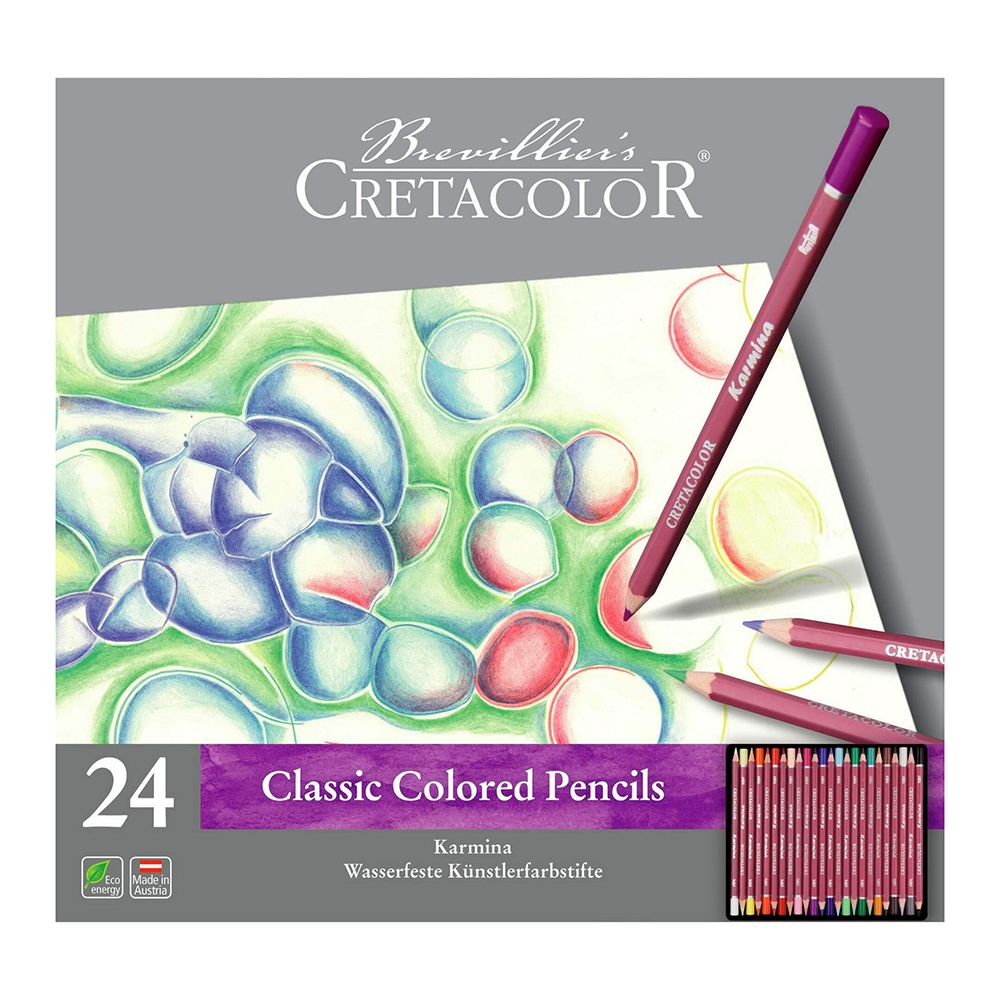 Sett med 24 fargeblyanter. Karmina fra Cretacolor er en klassisk fargeblyant, som er høyt pigmentert, lysekte og vannfast. Karmina er i sekskantet utførelse, med 3,8 mm fargemine.