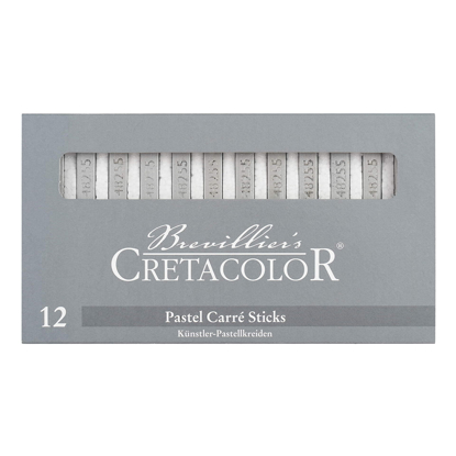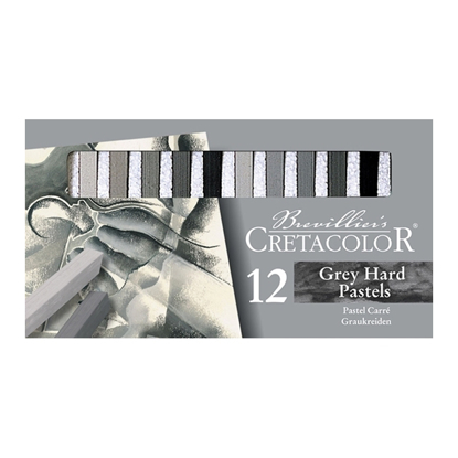 Grey Hard Pastels fra Cretacolor. Et sett med 12 pasteller i gråtoner. Fargene er i både varme og kalde gråtoner, og gir en fløyelsmyk, oljefri strek. Den brede siden av pastellen er ideel for store områder, og endene for presise og fine detaljer.