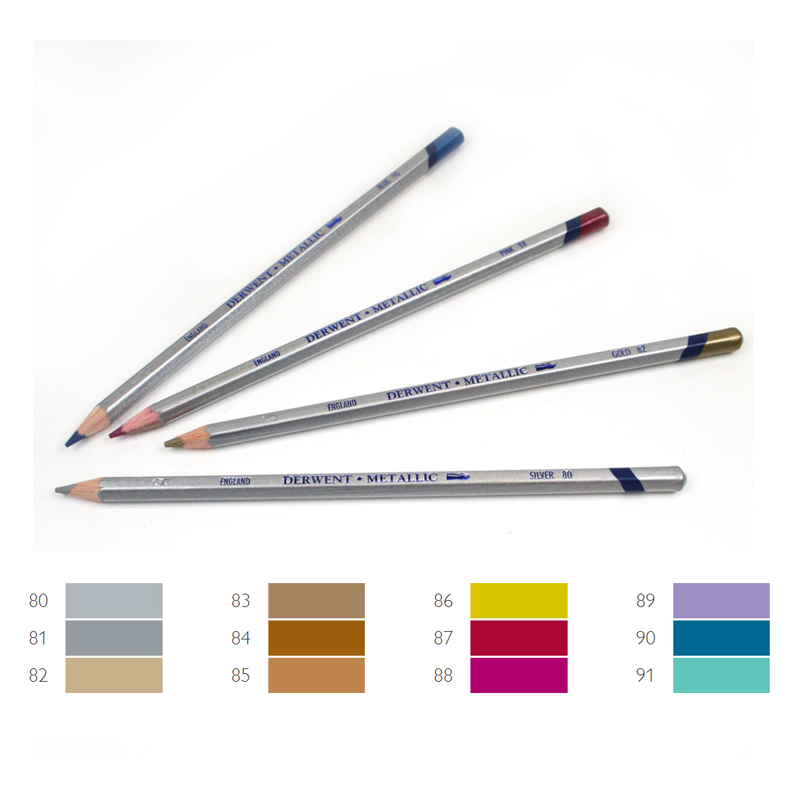 Metallic blyant fra Derwent. Fargeblyant med metallisk effekt, vannløselig. Kommer best frem på mørke bakgrunner. Sekskantet blyant med 3,4 mm mine. Finnes i 12 farger.