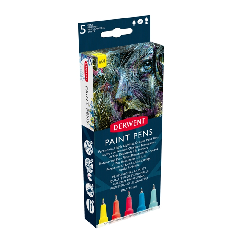 Paint Pen Palette #1 fra Derwent. Paint Pen fra Derwent (Tidligere Graphik Line Painter) er en fineliner fylt med lysekte, permanent, opakt og vannbasert blekk. Spissen er en robust kvalitetsspiss på 0,5 mm som er produsert i Japan, og gir en jevn, klar strek.