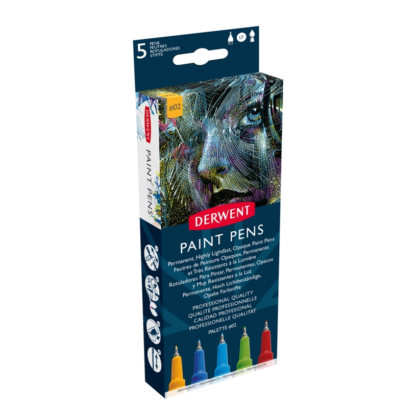 Paint Pen Palette #2 fra Derwent. Paint Pen fra Derwent (Tidligere Graphik Line Painter) er en fineliner fylt med lysekte, permanent, opakt og vannbasert blekk. Spissen er en robust kvalitetsspiss på 0,5 mm som er produsert i Japan, og gir en jevn, klar strek.