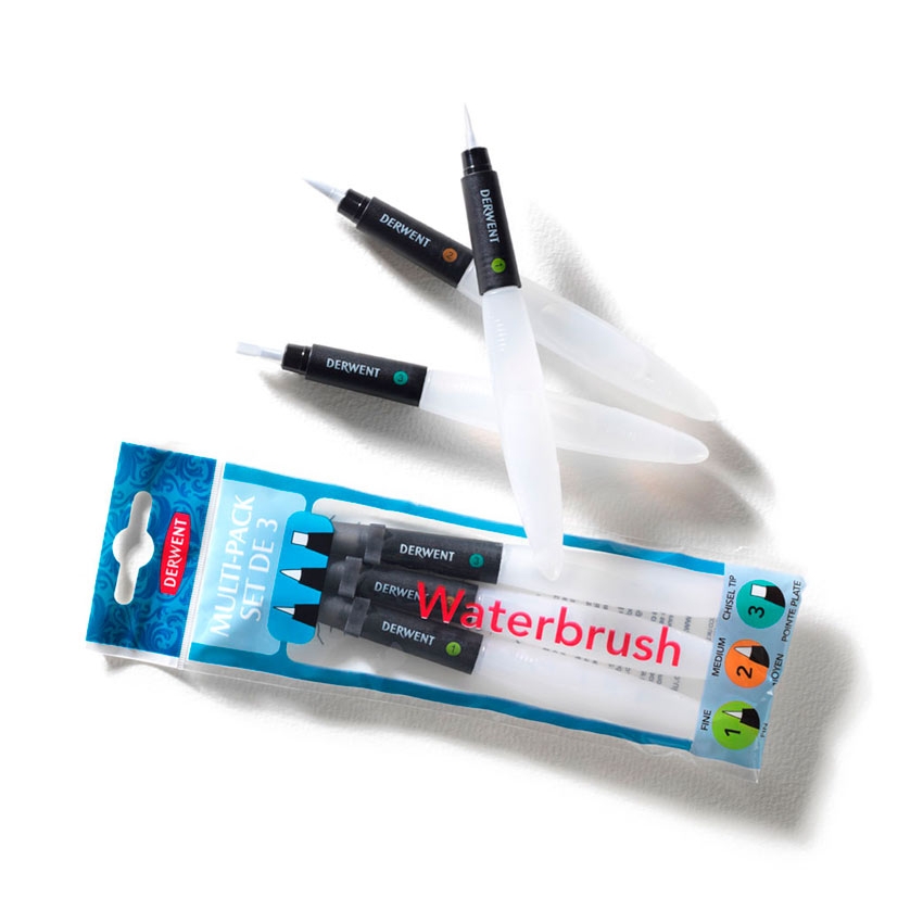 Derwent penseltusj med tre spisser, som har blitt utviklet for kunstnere som vilmale en plein air. Skaftet kan fylles med vann, ferdigblandet farge eller lignende. Du kan derfor slippe å frakte med deg ekstra vann om du skal male ute. Penslene er dryppsikre, enkle å frakte og lette å rengjøre. Chisel spissen gir klare, skarpe linjer eller brede strøk. Det følger også med tynn og medium pensel.
