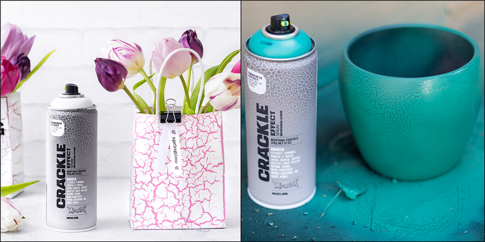 Crackle Effect er en spray som du kan spraye over «halvtørr» eller overflatetørr akrylmaling. Akrylmalingen kan være Montana GOLD akrylmaling på boks, eller en annen akrylmaling påført med pensel. Jo mindre tørr akrylmalingen under er, jo større blir krakelleringen. Etter at krakelleringen er tørr og herdet (1 døgn) kan du legge på en ferniss om du ønsker.