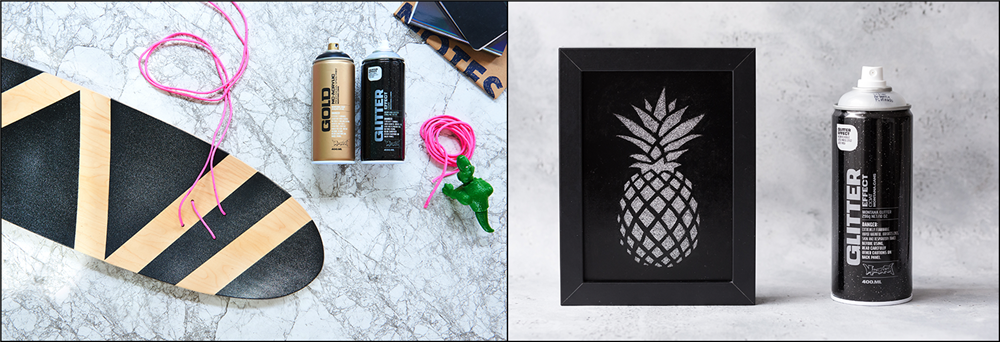 Montana Effect er en spraymaling som kan gi en spennende overflate til gjenstander og bilder. Du kan lage glitter-tekst på et bilde med Glitter Effect, marmorere vaser eller taklister med Marble Effect, krakkelere bilder med Crackle Effect eller lage krakker i "granitt" med Granit Effect.