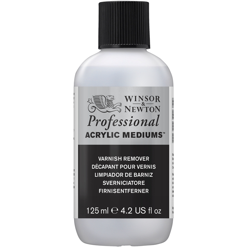 Varnish Remover fra W&N Professional Acrylic Mediums. Varnish Remover er et rengjøringsmiddel som tar bort ferniss, så bildet kan rengjøres og fernisseres på nytt.