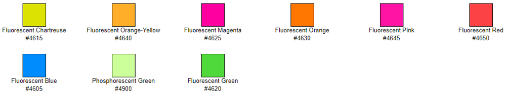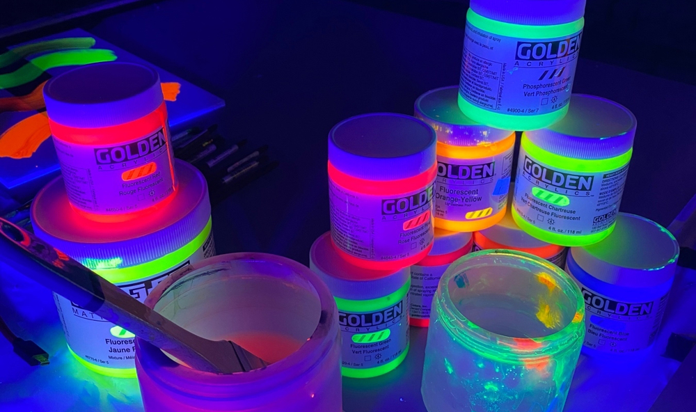 Fluoriserende farger fra Golden Artist Colors er intense farger som lyser under UV-lys. Fordi fluoriserende farger er transparante, oppnås det større intensitet når du bruker dem på lyse, hvite overflater. Fluoriserende farger er ikke lysekte, det er derfor anbefalt at du bruker en ferniss med UV-beskyttelse for å beholde den kule, intense fargen, selv om det det vil svekke gløden under UV-lys over tid. Finnes i fargene: Fluorescent Blue, Chartreuse, Green, Magenta, Orange, Orange Yellow, Pink og Red.