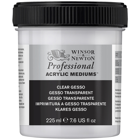 Clear Gesso fra W&N Professional Acrylic Mediums. Clear Gesso er en gesso laget av upigmentert klar harpiks, som tørker til en helt transparent finish. Den kan blandes med akrylmaling for å gi en fargetone til underlaget