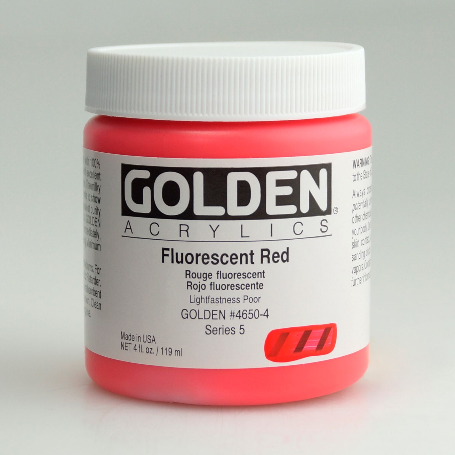 Fluoriserende akrylfarger fra Golden Artist Colors. Fargene er intense og vil lyse under UV-lys. Fluoriserende farger er ikke lysekte. Det er anbefalt å bruke topcoat/ferniss med UV-beskyttelse for å beholde den intense fargen, selv om det vil svekke gløden under UV-lys.