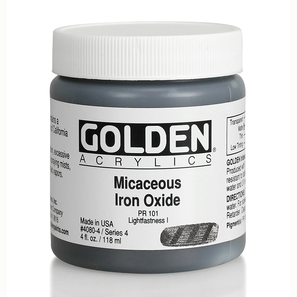 Micaceous Iron Oxide finnes i to konsistenser: Heavy Body og Fluid. Den er en varm, nesten sort farge som kan minne om fint sandpapir når den er tørr. Den gir en metallisk overflate, og den er fin alene eller som underlag for tegning med blyant, pasteller og fargeblyanter.