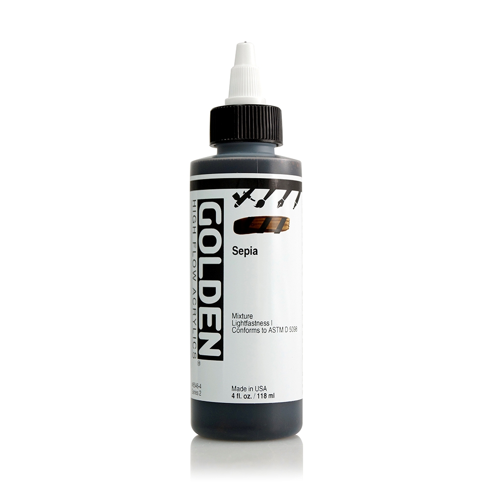 GOLDEN High Flow akrylmaling har høy intensitet, er tyntflytende og består av opake og transparente pigmenter. Fargene er tilnærmet tilsetningsfrie og produsert av 100% akrylpolymer og lysekte pigmenter*. High Flow har like høy kvalitet som alle andre Golden-produkter, og kan blandes med Fluid, Heavy Body, Open, medier, gesso og additiver. *Fluoriserende farger ikke lysekte. High Flow finnes i 49 farger og i størrelsene 30 ml og 118 ml.