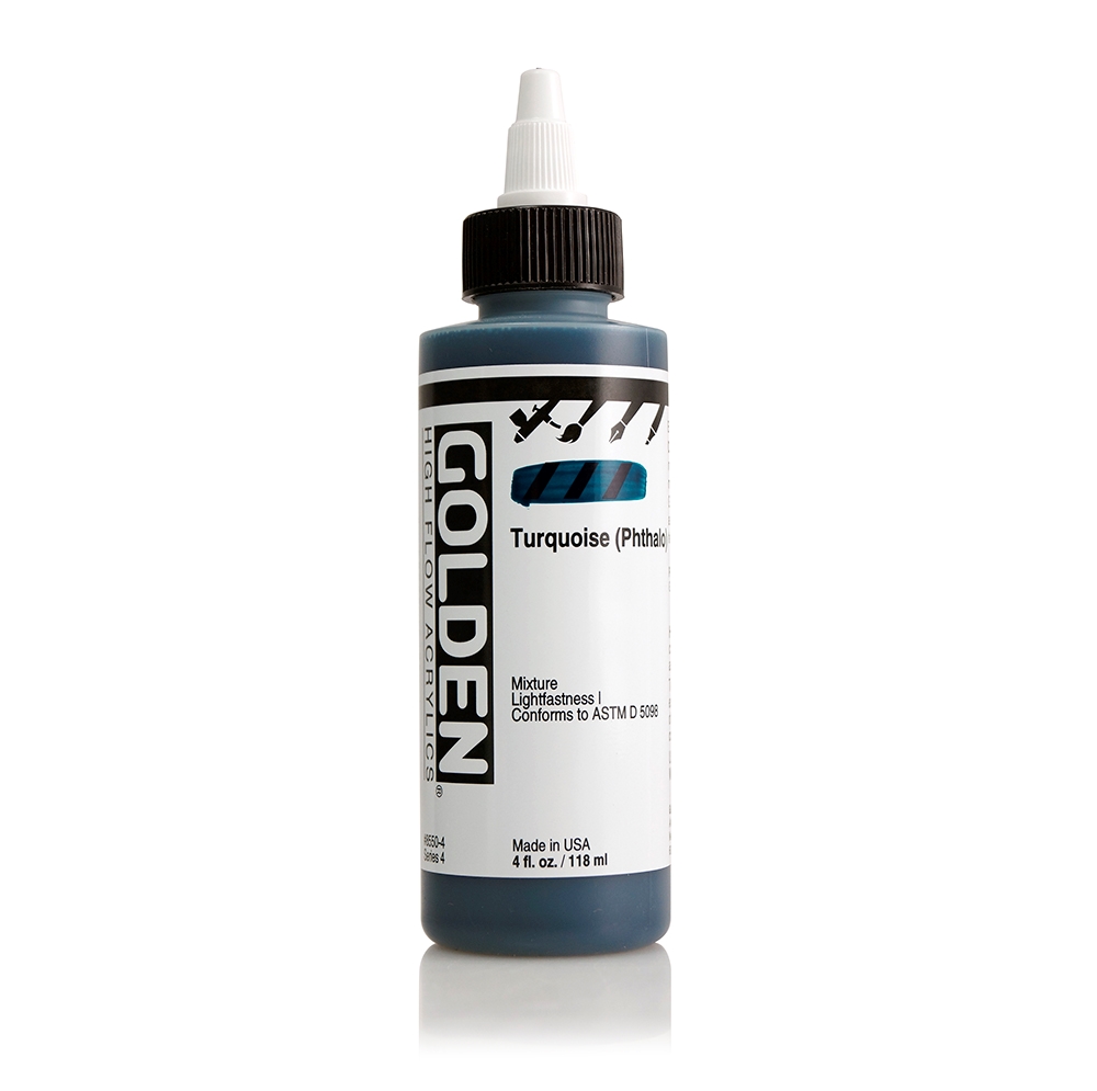 GOLDEN High Flow akrylmaling har høy intensitet, er tyntflytende og består av opake og transparente pigmenter. Fargene er tilnærmet tilsetningsfrie og produsert av 100% akrylpolymer og lysekte pigmenter*. High Flow har like høy kvalitet som alle andre Golden-produkter, og kan blandes med Fluid, Heavy Body, Open, medier, gesso og additiver. *Fluoriserende farger ikke lysekte. High Flow finnes i 49 farger og i størrelsene 30 ml og 118 ml.
