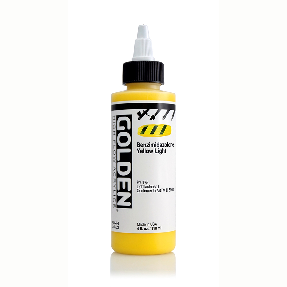GOLDEN High Flow akrylmaling har høy intensitet, er tyntflytende og består av opake og transparente pigmenter. Fargene er tilnærmet tilsetningsfrie og produsert av 100% akrylpolymer og lysekte pigmenter*. High Flow har like høy kvalitet som alle andre Golden-produkter, og kan blandes med Fluid, Heavy Body, Open, medier, gesso og additiver. *Fluoriserende farger ikke lysekte. High Flow finnes i 49 farger og i størrelsene 30 ml og 118 ml.