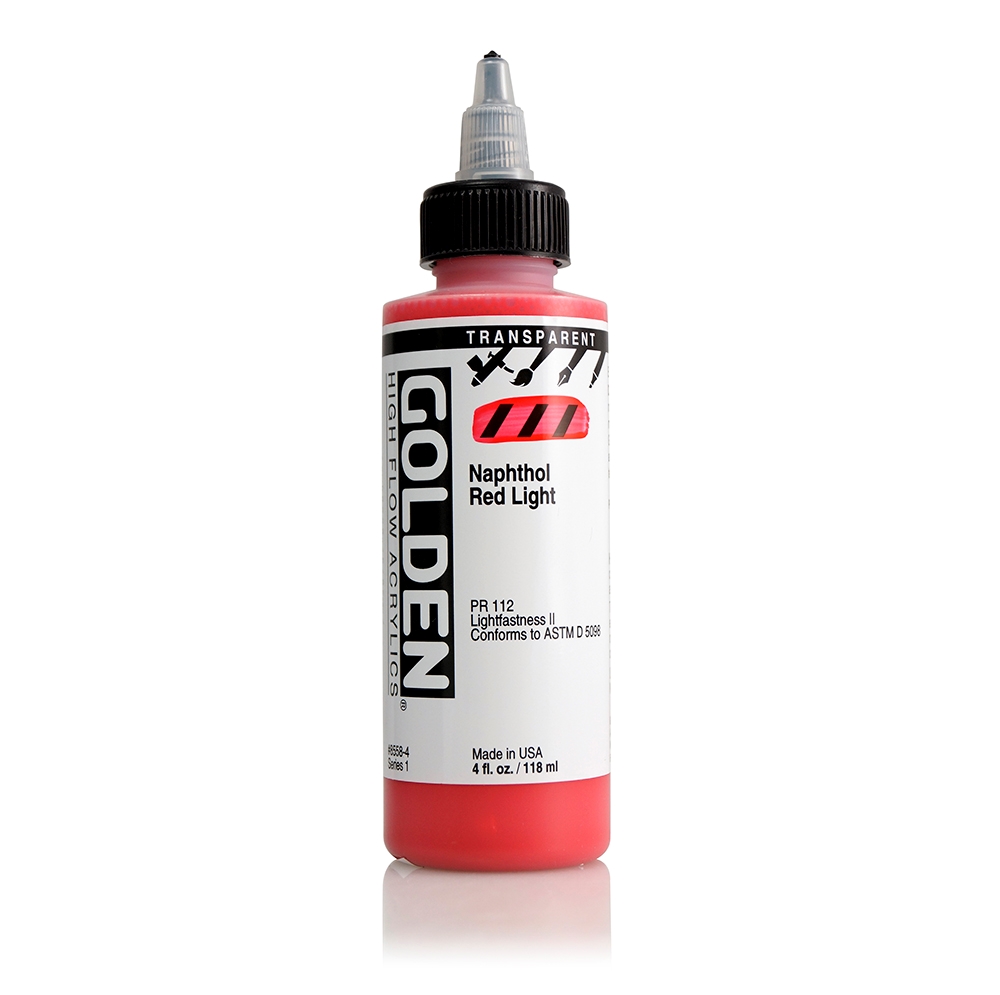 GOLDEN High Flow akrylmaling har høy intensitet, er tyntflytende og består av opake og transparente pigmenter. Fargene er tilnærmet tilsetningsfrie og produsert av 100% akrylpolymer og lysekte pigmenter*. High Flow har like høy kvalitet som alle andre Golden-produkter, og kan blandes med Fluid, Heavy Body, Open, medier, gesso og additiver. *Fluoriserende farger ikke lysekte. High Flow finnes i 49 farger og i størrelsene 30 ml og 118 ml.