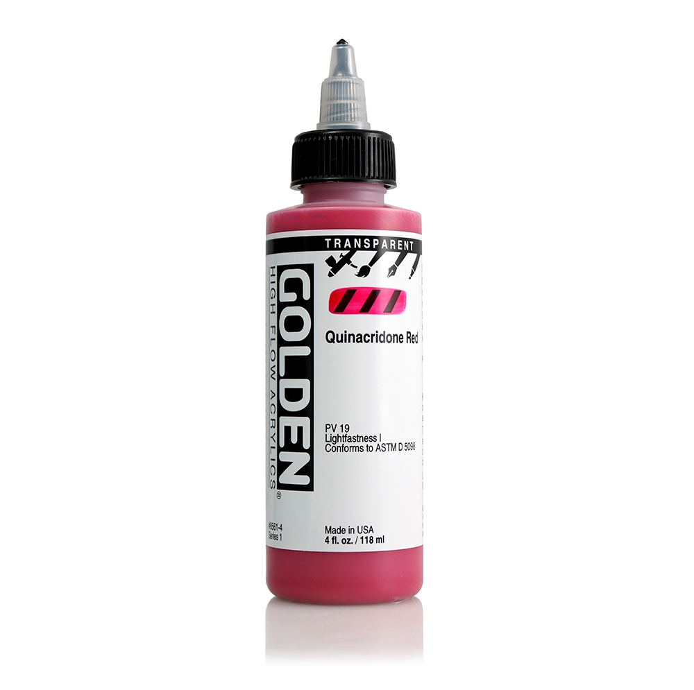 GOLDEN High Flow akrylmaling har høy intensitet, er tyntflytende og består av opake og transparente pigmenter. Fargene er tilnærmet tilsetningsfrie og produsert av 100% akrylpolymer og lysekte pigmenter*. High Flow har like høy kvalitet som alle andre Golden-produkter, og kan blandes med Fluid, Heavy Body, Open, medier, gesso og additiver. *Fluoriserende farger ikke lysekte. High Flow finnes i 49 farger og i størrelsene 30 ml og 118 ml.