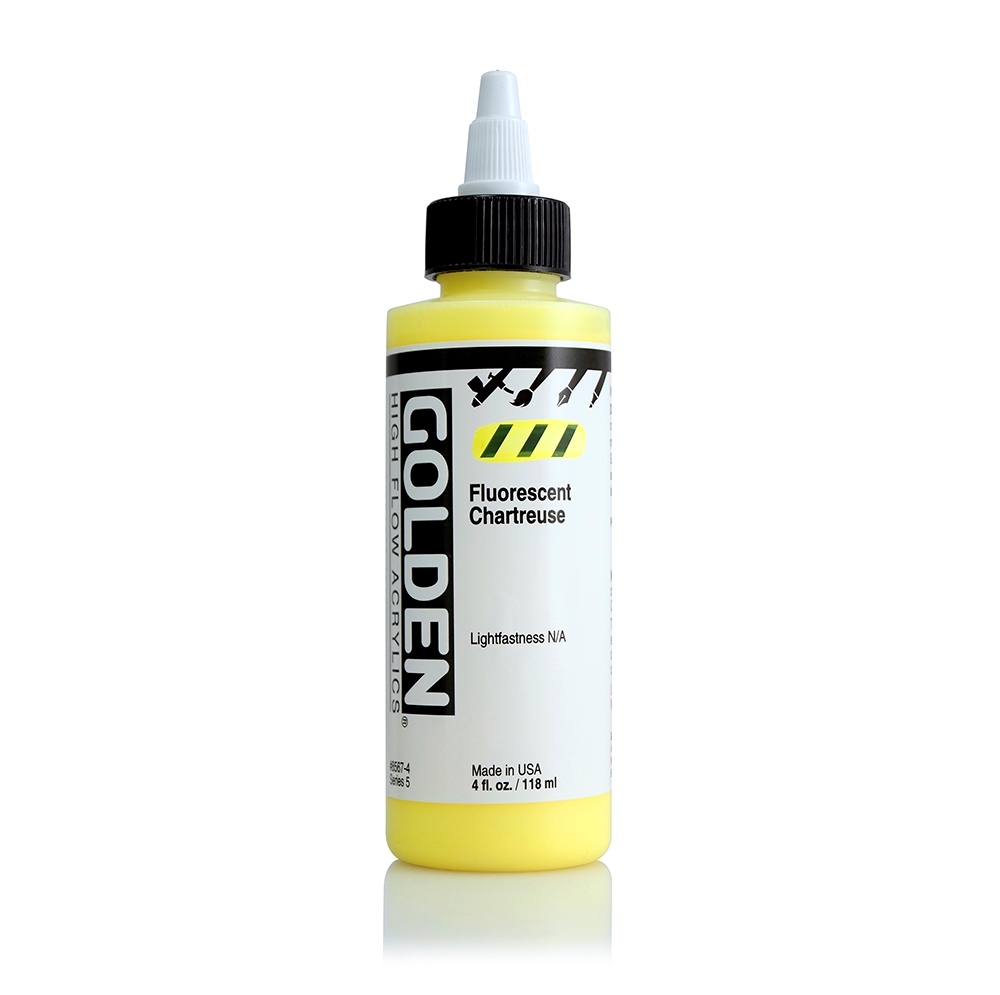 GOLDEN High Flow akrylmaling har høy intensitet, er tyntflytende og består av opake og transparente pigmenter. Fargene er tilnærmet tilsetningsfrie og produsert av 100% akrylpolymer og lysekte pigmenter*. High Flow har like høy kvalitet som alle andre Golden-produkter, og kan blandes med Fluid, Heavy Body, Open, medier, gesso og additiver. *Fluoriserende farger ikke lysekte. High Flow finnes i 49 farger og i størrelsene 30 ml og 118 ml.