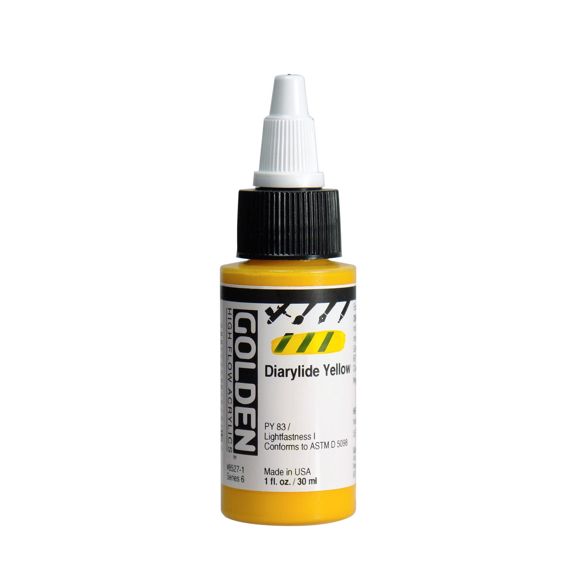 GOLDEN High Flow akrylmaling har høy intensitet, er tyntflytende og består av opake og transparente pigmenter. Fargene er tilnærmet tilsetningsfrie og produsert av 100% akrylpolymer og lysekte pigmenter*. High Flow har like høy kvalitet som alle andre Golden-produkter, og kan blandes med Fluid, Heavy Body, Open, medier, gesso og additiver. *Fluoriserende farger ikke lysekte. High Flow finnes i 49 farger og i størrelsene 30 ml og 118 ml.
