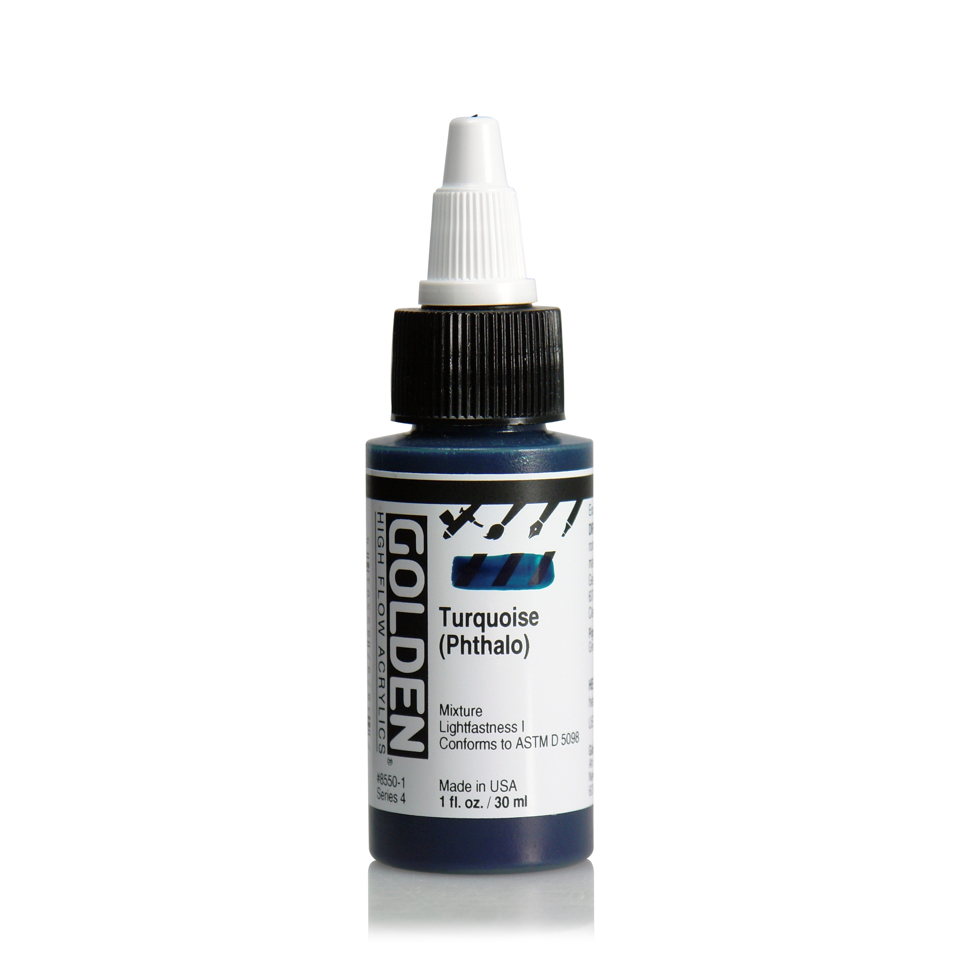 GOLDEN High Flow akrylmaling har høy intensitet, er tyntflytende og består av opake og transparente pigmenter. Fargene er tilnærmet tilsetningsfrie og produsert av 100% akrylpolymer og lysekte pigmenter*. High Flow har like høy kvalitet som alle andre Golden-produkter, og kan blandes med Fluid, Heavy Body, Open, medier, gesso og additiver. *Fluoriserende farger ikke lysekte. High Flow finnes i 49 farger og i størrelsene 30 ml og 118 ml.