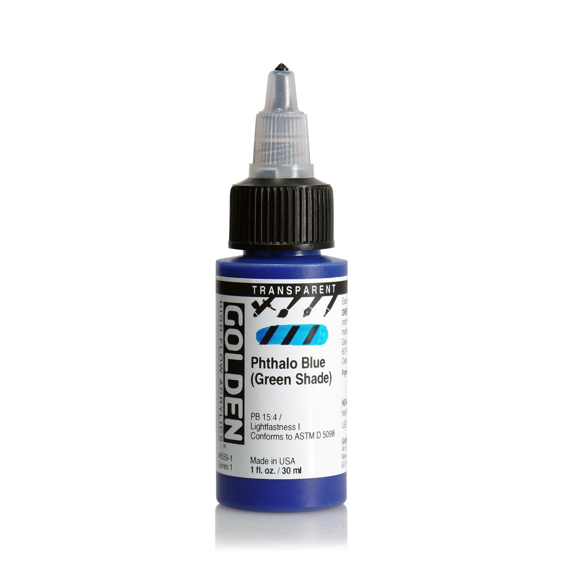 GOLDEN High Flow akrylmaling har høy intensitet, er tyntflytende og består av opake og transparente pigmenter. Fargene er tilnærmet tilsetningsfrie og produsert av 100% akrylpolymer og lysekte pigmenter*. High Flow har like høy kvalitet som alle andre Golden-produkter, og kan blandes med Fluid, Heavy Body, Open, medier, gesso og additiver. *Fluoriserende farger ikke lysekte. High Flow finnes i 49 farger og i størrelsene 30 ml og 118 ml.