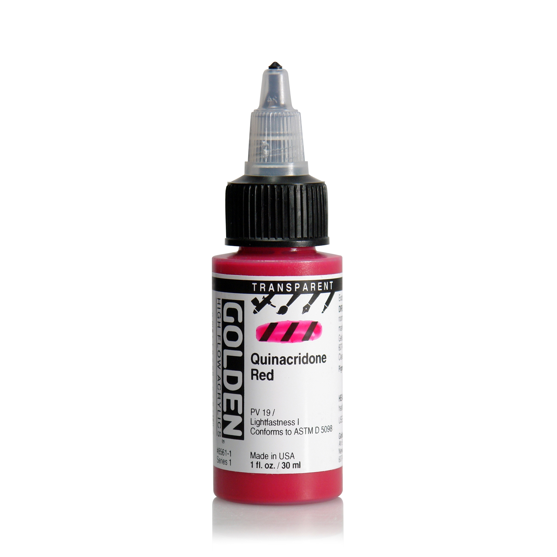 GOLDEN High Flow akrylmaling har høy intensitet, er tyntflytende og består av opake og transparente pigmenter. Fargene er tilnærmet tilsetningsfrie og produsert av 100% akrylpolymer og lysekte pigmenter*. High Flow har like høy kvalitet som alle andre Golden-produkter, og kan blandes med Fluid, Heavy Body, Open, medier, gesso og additiver. *Fluoriserende farger ikke lysekte. High Flow finnes i 49 farger og i størrelsene 30 ml og 118 ml.