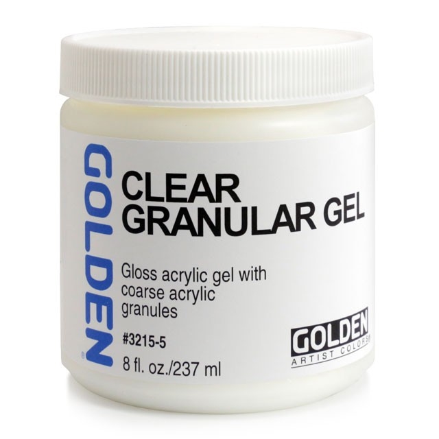 Gels og medier kan blandes i akrylmaling for å strekke malingen, endre tekstur, glans, og påvirke malingens flytegenskaper. De kan også brukes for seg selv for å gi transparente tekstur effekter.Gloss (blanke) Gels er de mest transparente, mens Matte er de mest opake.Clear Granulær Gel brukes for å skape en teksturert overflate. Tørker til en hard film. Kan blandes med andre medier eller Golden maling for å øke fleksibilitet.
