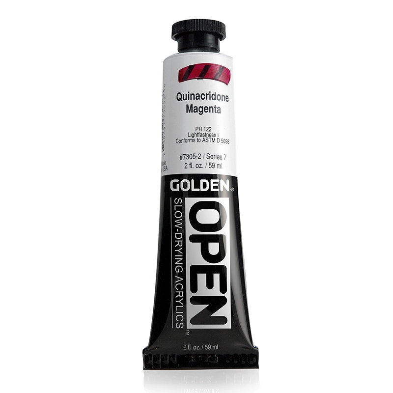 OPEN Slow Drying Acrylics - forblir våt mye lenger enn andre akrylmalinger, og hindrer at det skapes hinne på paletten under lengre arbeidsøkter. Arbeidstiden vil variere etter hvor tykt lag du legger. Tynne lag tørker relativt raskt, og tillater at ytterligere lag påføres eller blandes. Tykkere lag kan bearbeides i flere timer. Strøk på ca. 1,5 mm tykkelse vil tørke ekstremt sakte.