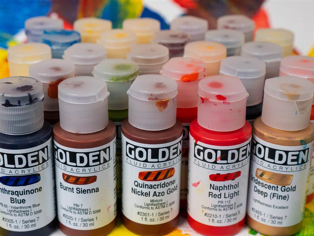 Golden Fluid Acrylics er en tyntflytende akrylmaling i kunstnerkvalitet. Golden Fluid er lysekte og har svært høy pigmentering. Den har samme fargeintensitet som Goldens velkjente Heavy Body, men en mye mer flytende konsistens, nesten som kremfløte.