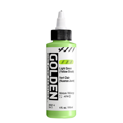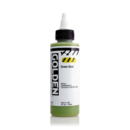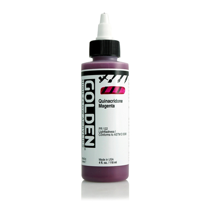 GOLDEN High Flow akrylmaling har høy intensitet, er tyntflytende og består av opake og transparente pigmenter. Fargene er tilnærmet tilsetningsfrie og produsert av 100% akrylpolymer og lysekte pigmenter*. High Flow har like høy kvalitet som alle andre Golden-produkter, og kan blandes med Fluid, Heavy Body, Open, medier, gesso og additiver. *Fluoriserende farger ikke lysekte. High Flow finnes i 49 farger og i størrelsene 30 ml og 118 ml.