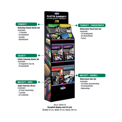 Butikkdisplay med 34 gavesett Tegne-Male 2025