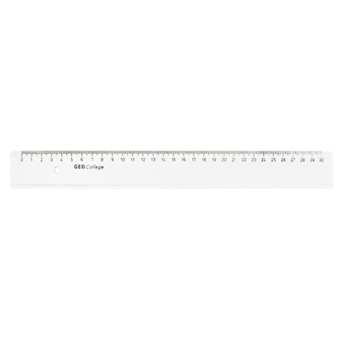 Transparent linjal med fasettslipt kan, tusjkant og mm-skala.