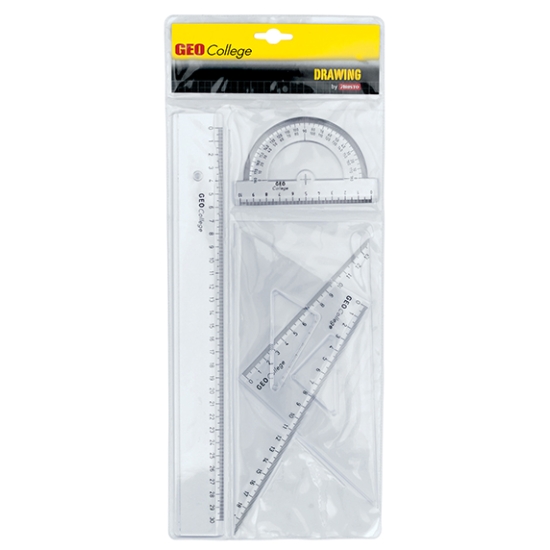 Inneholder: Linjal 30 cm, vinkelhake 45gr-14cm mållinje, vinkelhake 60gr-20 cm mållinje, transportør 10 cm.