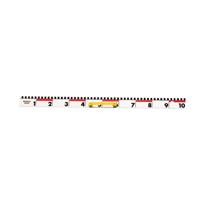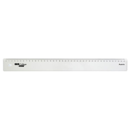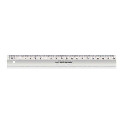 Transparent linjal med fasettslipt kan, tusjkant og mm-skala.