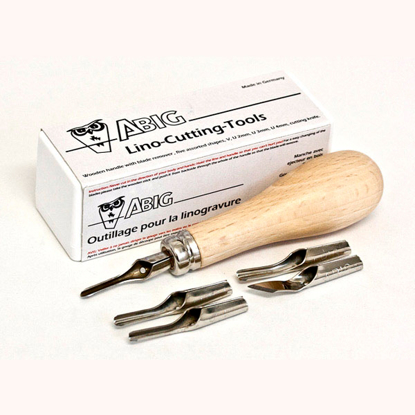 Et komplett sett fra ABIG Lino-Cutting-Tools. Settet har kniv med skaft og 5 ulike knivblad for ulike snitt. Knivene brukes til å skjære frem motivet i linoplatene.