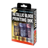 Linofarge sett fra Essdee med metalliske trykkfarger i 100 ml. Linofargene er i gull, sølv og bronse og egner seg til linotrykk/linoleumstrykk og andre trykketeknikker.