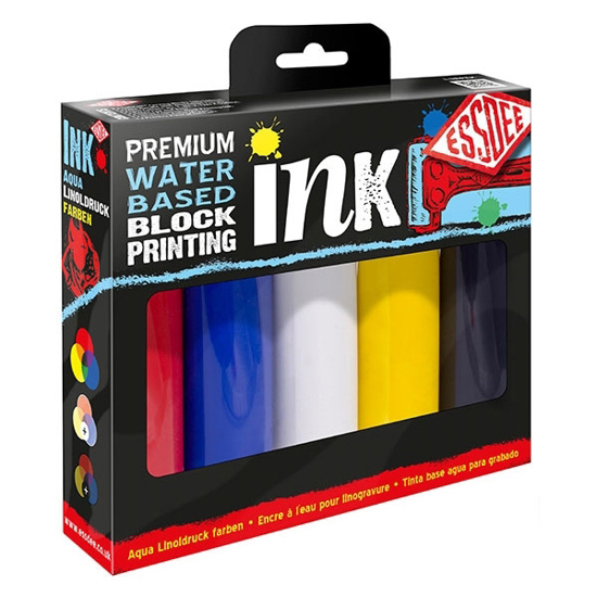 Linofarge primærsett fra Essdee med trykkfarger i 100 ml. Linofargene er i primærfargene blå, gul, rød, sort og hvit og egner seg til linotrykk/linoleumstrykk og andre trykketeknikker.