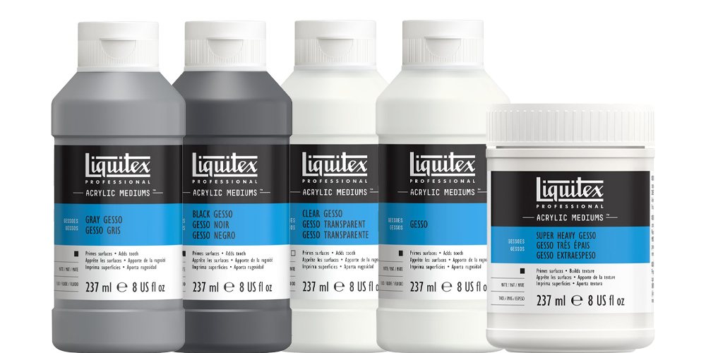 Liquitex sine profesjonelle gessoer skaper den perfekte absorberingsevnen, teksturen og grunningen og passer til alle typer underlag, fra lerret til metall. Utvalget står mellom fem spesialiserte formler. For farger: klar, hvit, grå og svart. Super Heavy Gesso gir tekstur og fungerer som et sterkere grunnlag for strukturarbeid.