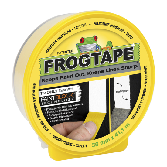 FrogTape® er basert på patentert PaintBlock® teknologi som forsegler kantene og forhindrer malingen i å krype under. Når PaintBlock® kommer i kontakt med vannbasert maling, oppstår en gel som danner en mikrobarriere slik at maling ikke kan løpe under, og dermed oppnår man perfekte resultater.