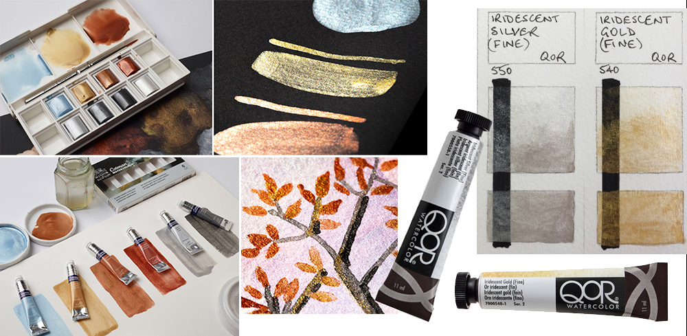 Akvarellmaling kan også skinne! Vi har metalliske akvarellfarger fra Winsor & Newton, Derwent og QoR. Med akvarellmediumet Iridescent Medium fra Winsor & Newton kan du dessuten gi perlemor og glittereffekt til alle akvarellfarger. Mediet kan enten blandes direkte med fargen, eller påføres etter at malingen er tørr.