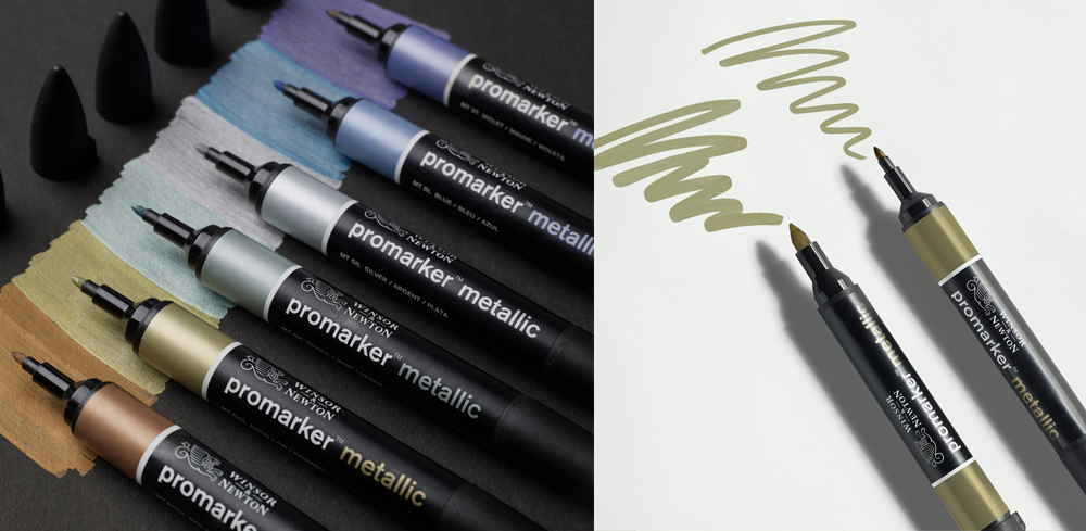 Promarker Metallic fra Winsor & Newton er en tusj i metalliske toner. Promarker Metallic kommer i 6 farger og inneholder vannbasert tusjblekk. Den har en rund og en fin spiss. For best resultat bør den brukes på tusjpapir eller mixed media papir i hvitt eller sort.