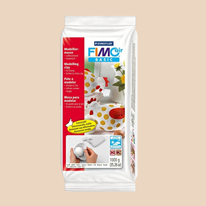 Fimo Air fra Staedtler. En lufttørkende leire som kan både males og lakkes når den er tørr. Det er enkelt å jobbe med den, med både hender, kjevle og annet utstyr til leire og form. Den finnes i lys farge, hvit og i terracotta. Den tørker etter noen timer i romtemperatur. Leiren må pakkes godt inn om du ikke bruker opp hele, da den tørker i luft.
